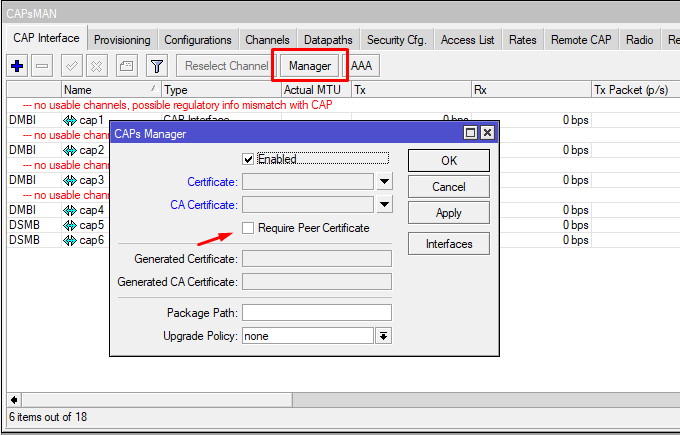 Info: configuration.manager should only be set on the CAP device itself. The interface acting as CAP may need additional configuration under /interface/wifi/set wifiX configuration.manager=.